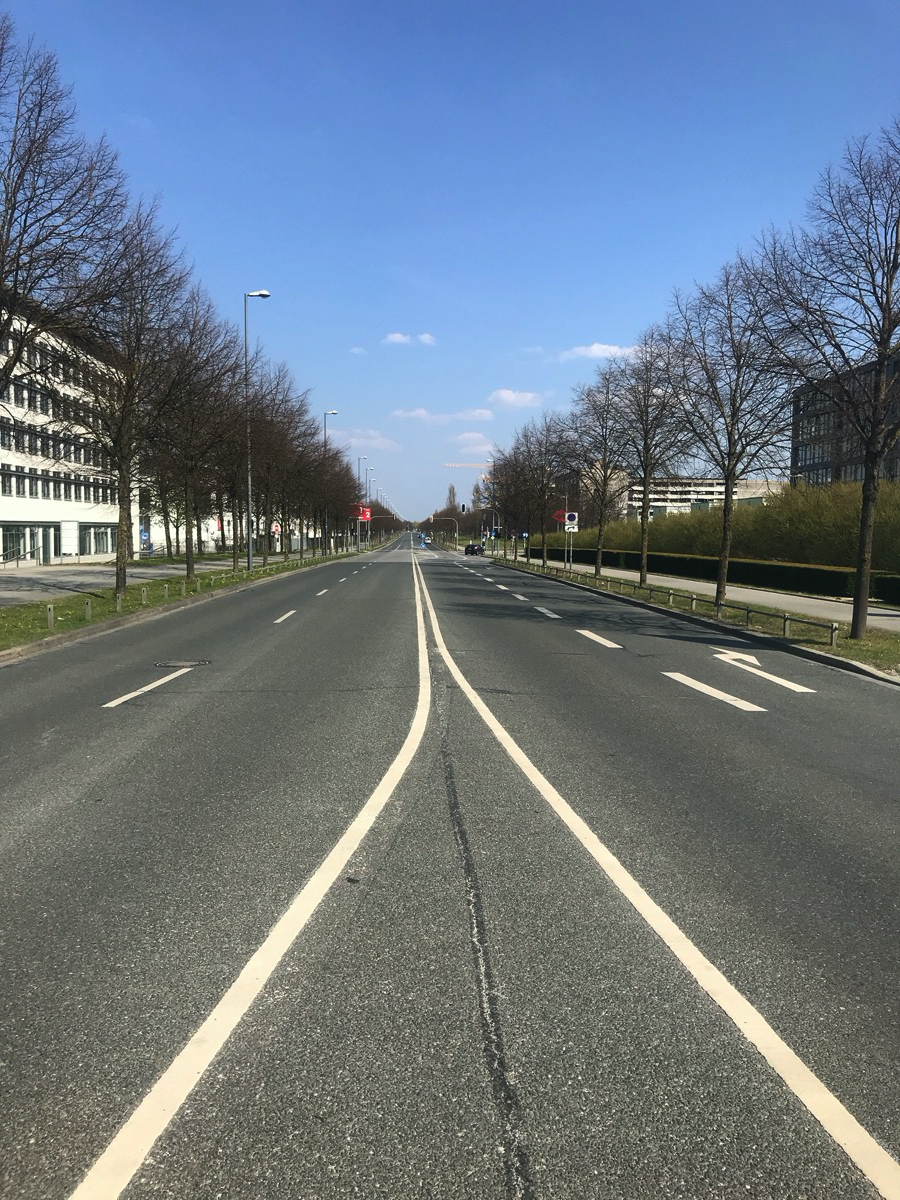 Zuerst kommt die Galopprennbahn, dann der kleine See vor der Messe (See 1). Die Straßen in der Messestadt sind leer, die zukünftige Bibliothek im Bau. Weiter geht’s zum Riemer See (See 2). In Ottendichl verkauft jemand Paletten (ohne Bier, 1€). Auf der alten Landebahn vom Fliegerhorst Neubiberg ist viel Platz zum Distanzieren. Vor dem Unterhachinger Stadion glitzert dann noch der namenlose See 3 in der Sonne. Auf der A8-Einflugschneise aus den Bergen heute eher wenig Rückreiseverkehr.