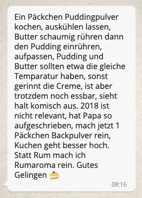 In den Antworten zum Tweet schreiben sehr viele Menschen, dass sie genau solche Rezepte auch von ihren Omas und Müttern weitervererbt bekommen haben (dass das unsere Kinder auch mal von ihren Vätern vererbt bekommen, daran arbeiten wir die nächsten Jahre, ok Männer!?). Einige posten sogar eigene Haus- und Geheimrezepte im Thread. Ich hab die mal alle herausgefischt und werde die Tweets hier archivieren, dann kann jeder die Sachen nachbacken. Falls ihr auch noch solche Rezepte mit Erinnerungen habt, immer her damit. Am besten an den Thread anhängen oder hier in die Kommentare.