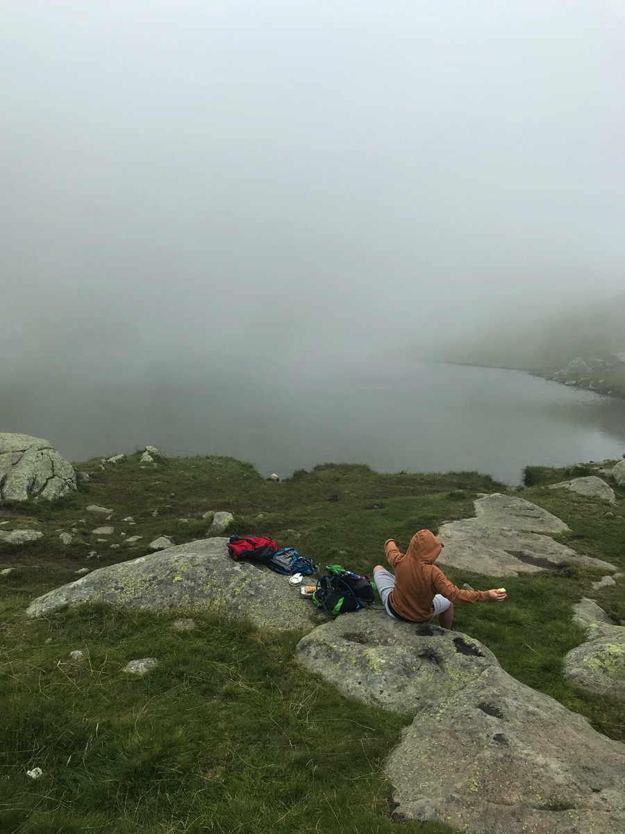 Nach knapp zwei Stunden erreichen wir den Laugensee. Ziemlich eingenebelt alles und gegen 11 Uhr sind wir noch fast alleine am Ufer des kleinen Bergsees.