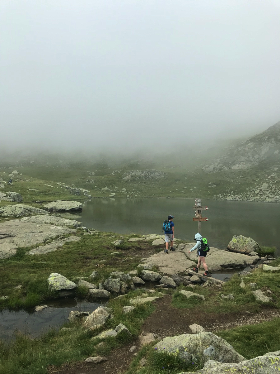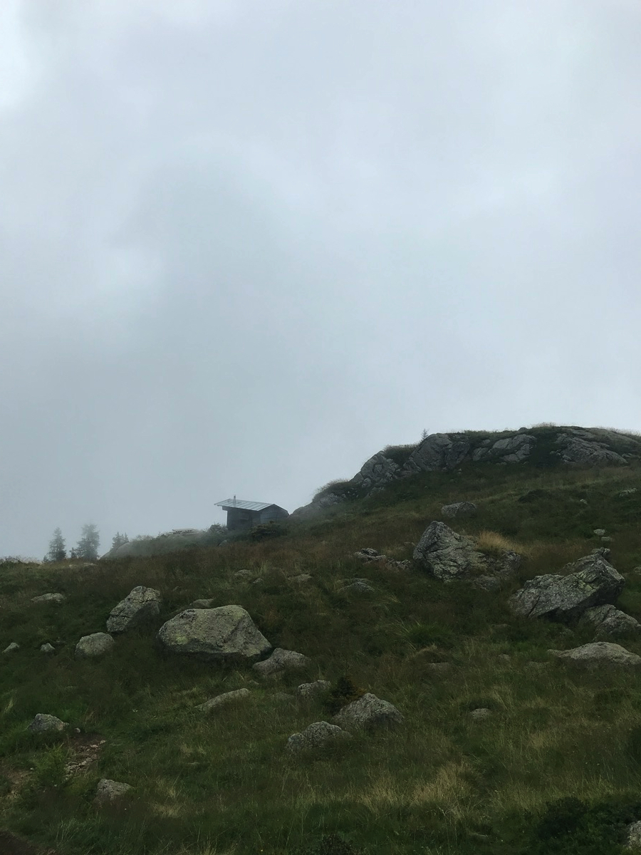 Es geht los am frühen Morgen am Gampenpass. Man kann die Runde von dort aus in beide Richtungen starten. Wir gehen direkt am Anfang nach rechts hoch. Es wird sofort steil, Trittsicherheit auf dem Wanderpfad ist angebracht. Je weiter wir hochkommen, desto nebliger und bewölkter wird es.