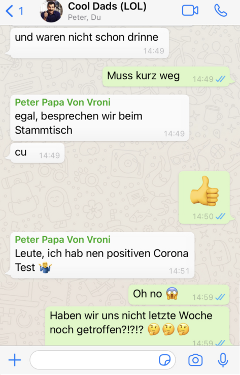 Nach ein bisschen Hin-und-her-Schreiben seid Ihr Euch dann mit allen Beteiligten einig, dass Ihr eine Risikobegegnung hattet („Willst Du noch mit hochkommen auf eine kleine Risikobegegnung?!“).