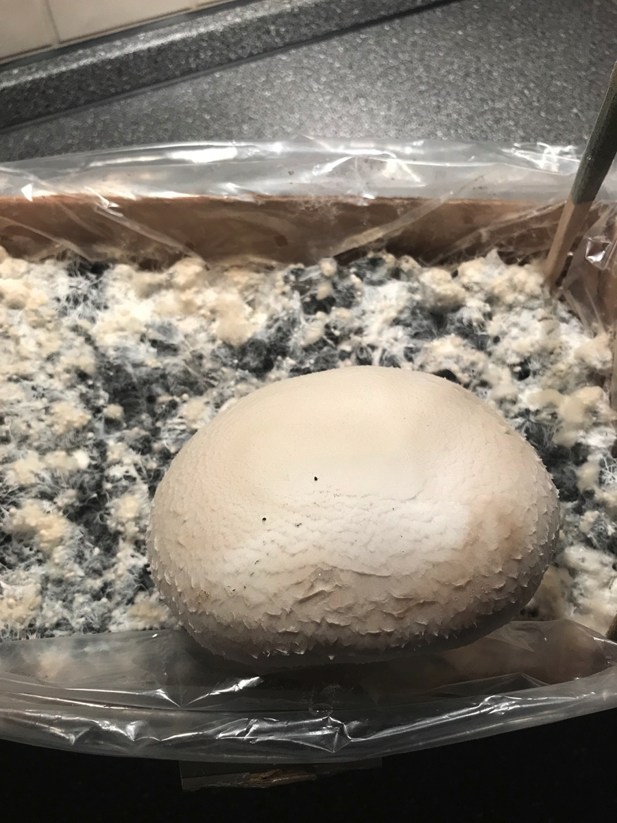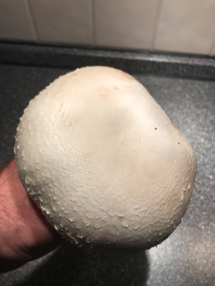 Und siehe da: Es ist ein Champignon! Und was für ein großer (das links auf dem Bild ist meine Hand). Mal schauen, was die nächsten Wochen noch bringen.