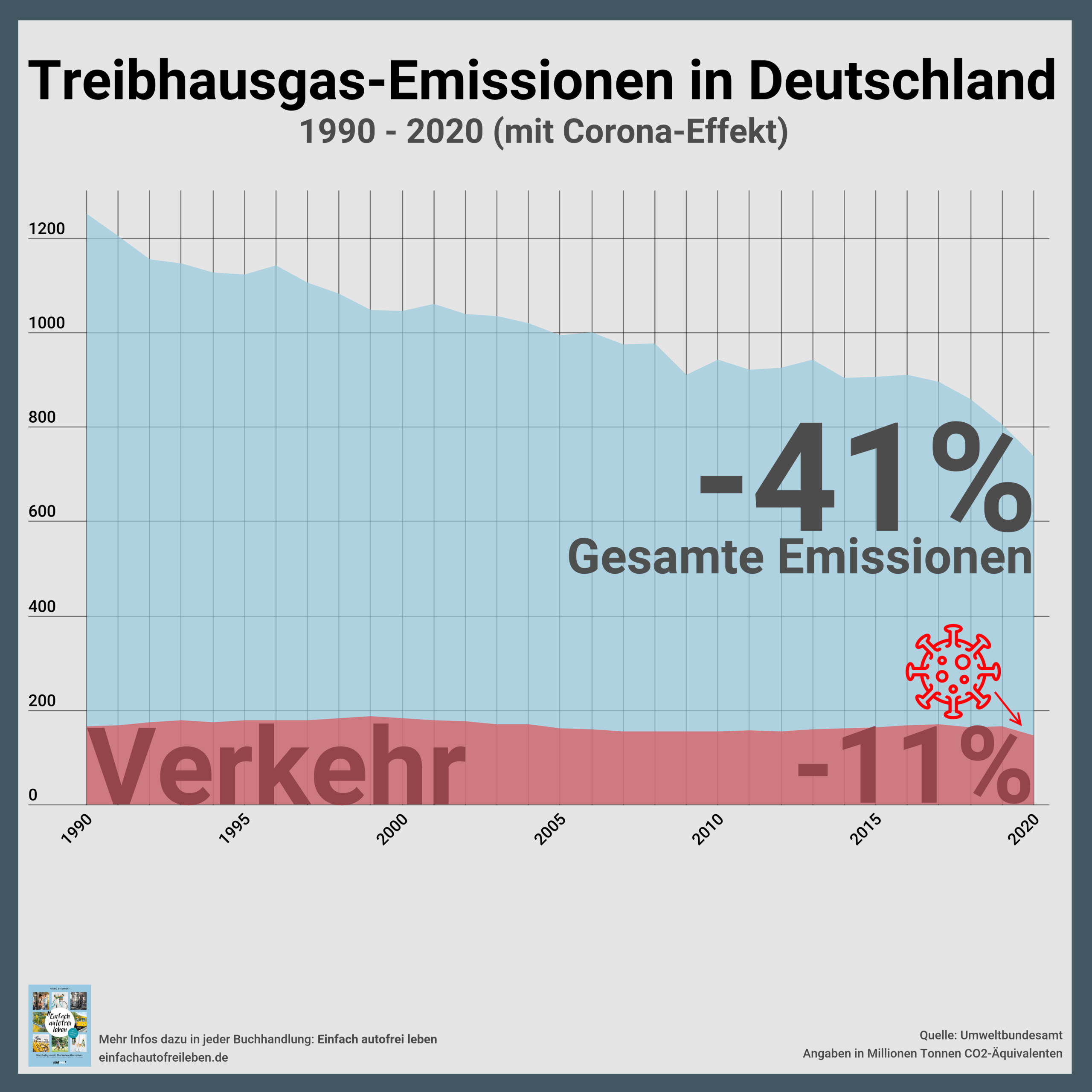 Die gesamten Treibhausgas-Emissionen der Bundesrepublik sind von 1990 bis 2019 um knapp 36% zurückgegangen. In einzelne Sektoren (z.B. Industrie oder Energie) wurden die Emissionen deutlich gesenkt. Im Verkehrssektor lag die Reduktion bis 2019 aber bei lediglich 0,06 %.