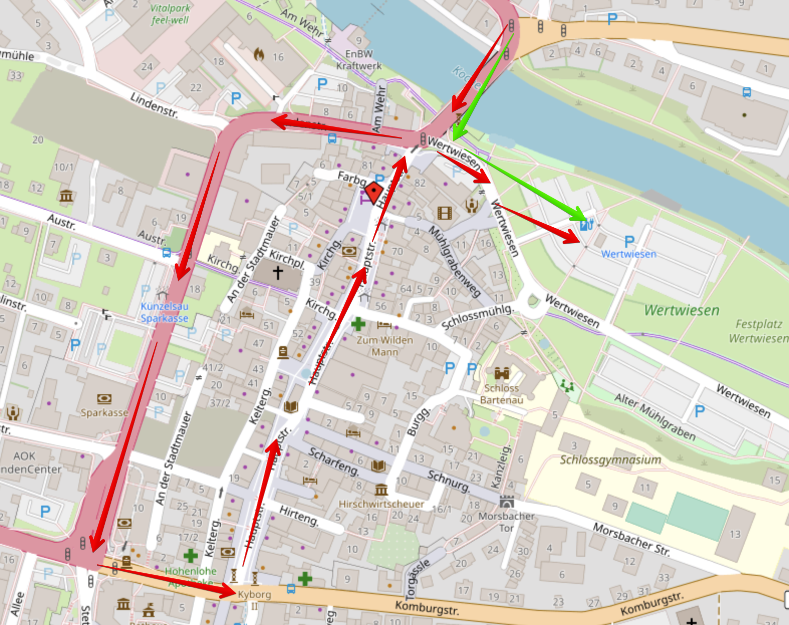 Wenn man über die Kocherbrücke zum Einkaufen kommt, kann man eigentlich direkt links abbiegen und das Auto auf dem wirklich sehr großen „Wertwiesen“-Parkplatz abstellen. Die meisten machen das auch. Viele biegen aber nicht gleich links ab, sondern fahren erst die Runde durch die Innenstadt (roter Pfeil).