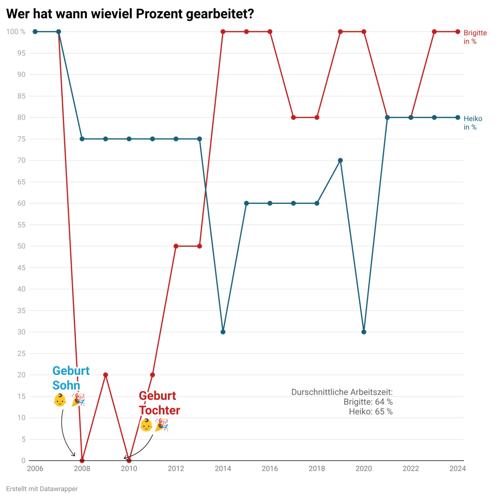 Dass das alles immer in Teilzeit möglich war, ist ein sehr großes Privileg. Für den Eltern ohne Filter Podcast habe ich versucht, die Erwerbsarbeitsbiografie von meiner Frau und mir seit der Geburt der Kinder zu rekonstruieren. Die Grafik hat ein paar Unschärfen, aber im Großen und Ganzen passt es schon.