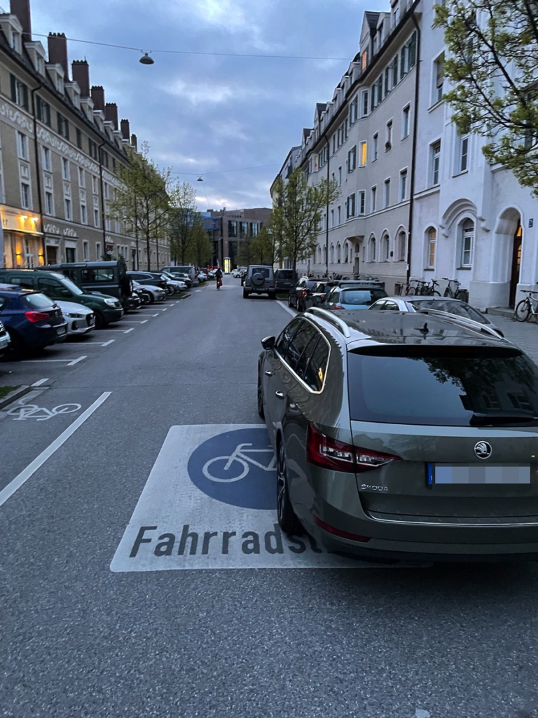 Auch sympathisch bei der Basketballsache: Es geht alles schneller als z.B. Fußball in der Allianz-Arena. Weniger Menschen, zentralere Lage, kaum Wartezeiten. Spielende um 20 Uhr, um 20:30 sitzen wir im Wirtshaus Eder. Auf dem Weg dahin noch ein kurzer Blick auf den Stand der Verkehrswende in der Landeshauptstadt. Es gilt die alte Verkehrsregel nach StVO-Gewohnheitsrecht: eine Fahrradstraße ist es nur, wenn eine Karre auf der Fahrradstraßenmarkierung parkt. Apropos Verkehrswende: Brose Bamberg heißt mir Vorname wie der weltweit viertgrößte Automobilizulieferer in Familienbesitz. Die haben auch eine Vision von Zukunftsmobilität . Man kann also bald noch entspannter und mit Wohlfühlerlebnis sein Auto mitten in die Fahrradstraße abstellen.