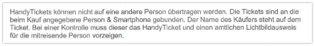 Das stimmt. Zumindest für die MVG-App. In der MVV-App, mit der man ebenfalls Tickets für den Münchner ÖPNV kaufen kann, kann man aber sehr wohl Tickets auch auf eine andere Person und Handy übertragen. Dort wäre das App und Account-Sharing also legal gewesen. In den FAQ der MVV-App wird das sogar für Minderjährige explizit als Workaround erwähnt.