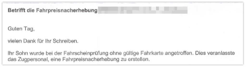 Am 11. März wird der Sohn in der S-Bahn kontrolliert. Der Kontrolleur gibt ihm einen Fahrpreisnacherhebungsbeleg über 60 € mit. Auf dem Beleg ist die Möglichkeit auf Einspruch vermerkt. Ich schildere den Fall am 12. März ausführlich in ein DB-Webformular rein. Jetzt ist das Antwortschreiben da: