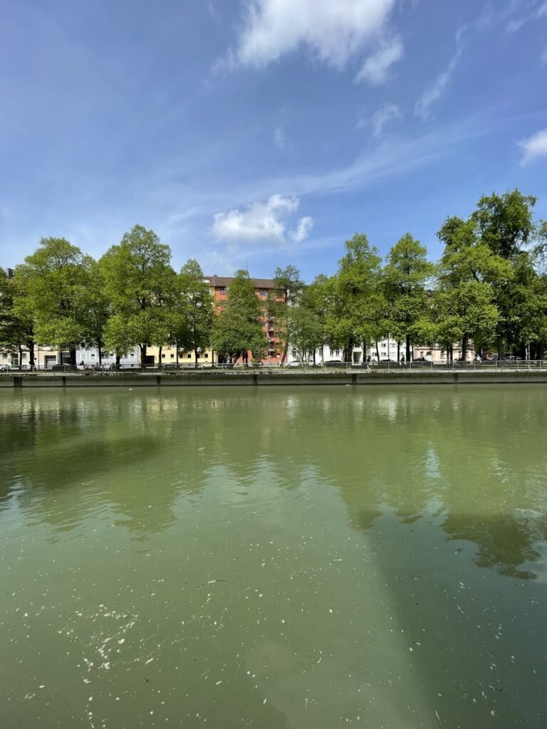 In Flussrichtung. Abwechslung, raus aus dem Alltagstrott. Ich mag den Mauersteg kurz nach der Muffathalle. An sonnigen Sonntagen meistens schwer schnell überholend passierbar weil viele Flaneure. Heute morgen um 10 ging es noch ganz gut.
