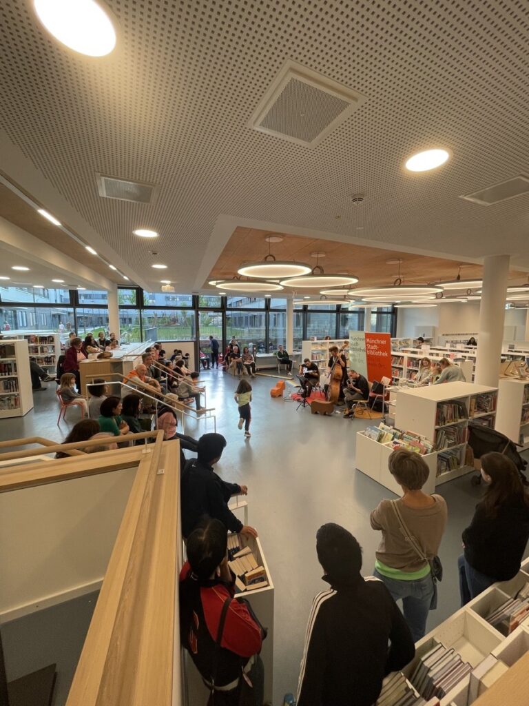 Drinnen spielt mittlerweile ein Trio dezent Musik. Drumherum hören manche aufmerksam zu, manche blättern in Büchern, andere tanzen ein bisschen. Kinder rennen zwischen Jazz-Trio und Regalen rum, sitzen mit Kopfhörern am PC, ein Rollifahrer scannt das Regal mit den Ratgebern, zwei Jungs spielen im Nebenraum seit Stunden Monopoly und im Lernzimmer wird: gelernt.