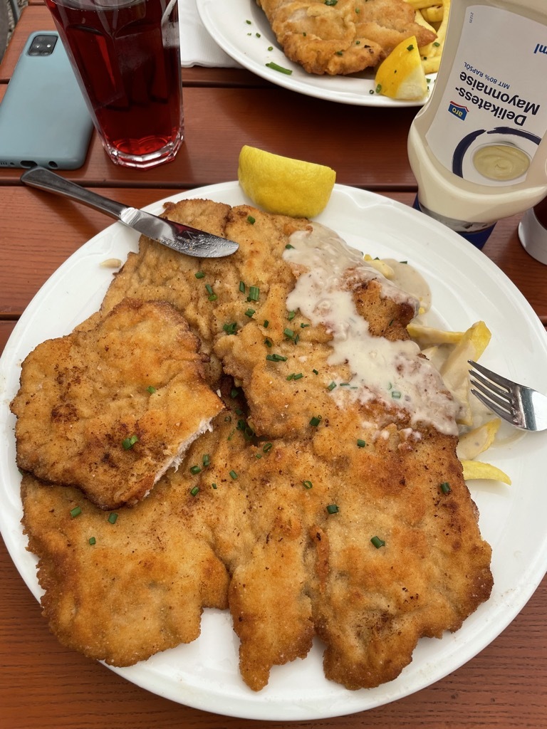 Mittagessen in Andys Krabblergarten. Falls ihr mal in München in der Nähe des Sendlinger Tors Hunger bekommt: Andy hat Schnitzel für euch. Der Laden sieht von außen nicht so ganz doll einladend aus, aber im Hinterhof schlummert ein Kleinod an Biergarten. Die Schnitzel sind legendär riesig. Ich fotografiere den Teller und fühle mich dabei ein bisschen schmutzig, weil es sich nach Markus-Söder-Wahlkampf anfühlt. Dann poste ich das Bild in den Familienchat. Ich poste oft Bilder in den Familienchat, normalerweise ohne irgendeine Reaktion hervorzurufen. Nach dem Schnitzelbild schreibt der Sohn nach 10 Sekunden kurz und knapp zurück: "Wo!?"