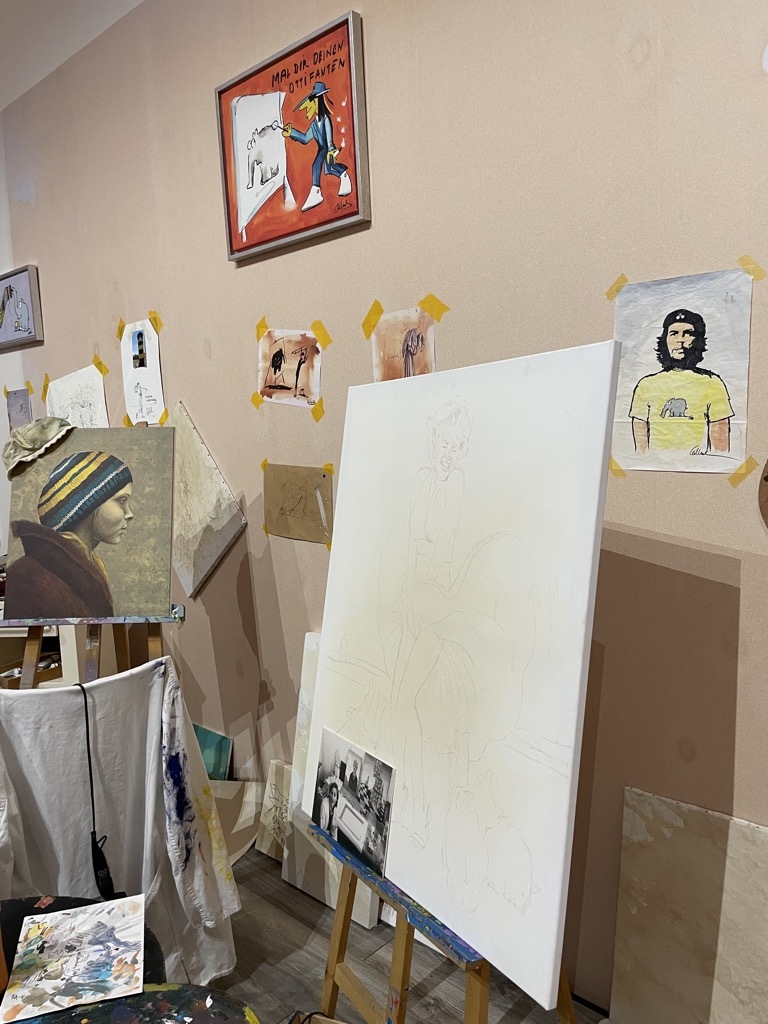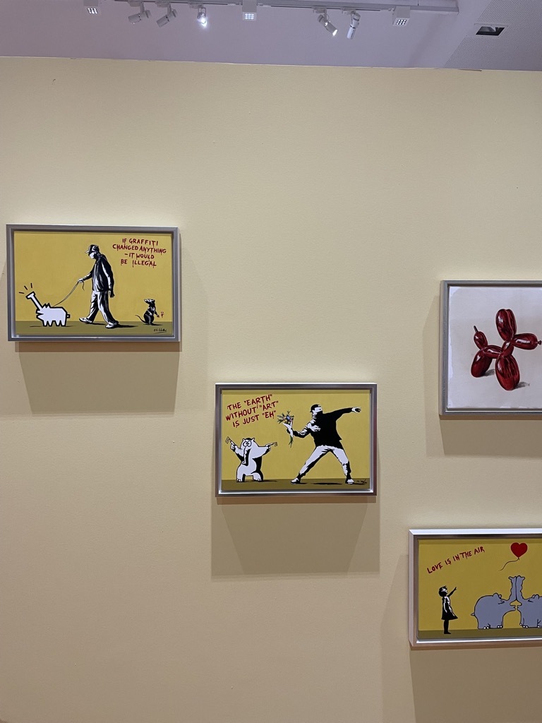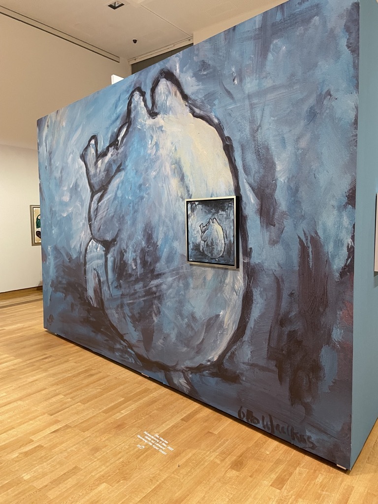 In der Ausstellung gibt es auch ein paar kleinere Bereiche, wo alte Sketche laufen und auf Ottos Curriculum vitae zurückgeblickt wird, aber der größte Teil besteht aus seinen neueren Gemälden, die er vor allem in den letzten 10 bis 15 Jahren gemalt hat. Das Prinzip ist fast immer gleich: in ein bekanntes Werk der Kunstgeschichte ein paar Ottifanten reinmalen. Irgendwie aber so originell und auch wirklich gekonnt gemacht, dass es mir überhaupt nicht langweilig wird. Schön.