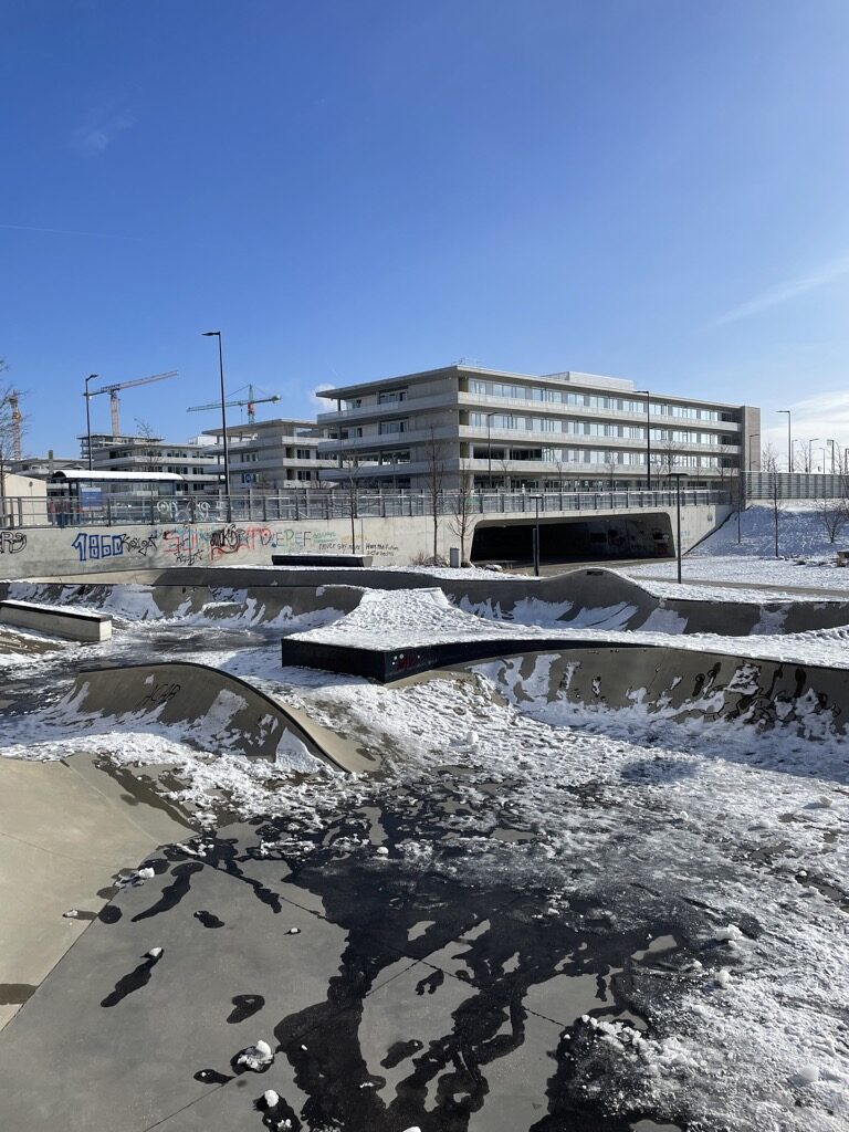 Auf der anderen Straßenseite erstreckt sich der riesige Bildungscampus. Vier Schulen, Mensa und sonstiger Pipapo. Schon eröffnet und in Betrieb.