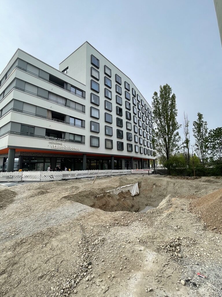 Vor der Bibliothek ein Loch und viel Bauschutt. Der Elisabeth-Castonier-Platz wird endlich zu einem echten Platz hergerichtet. Zeit wirds!