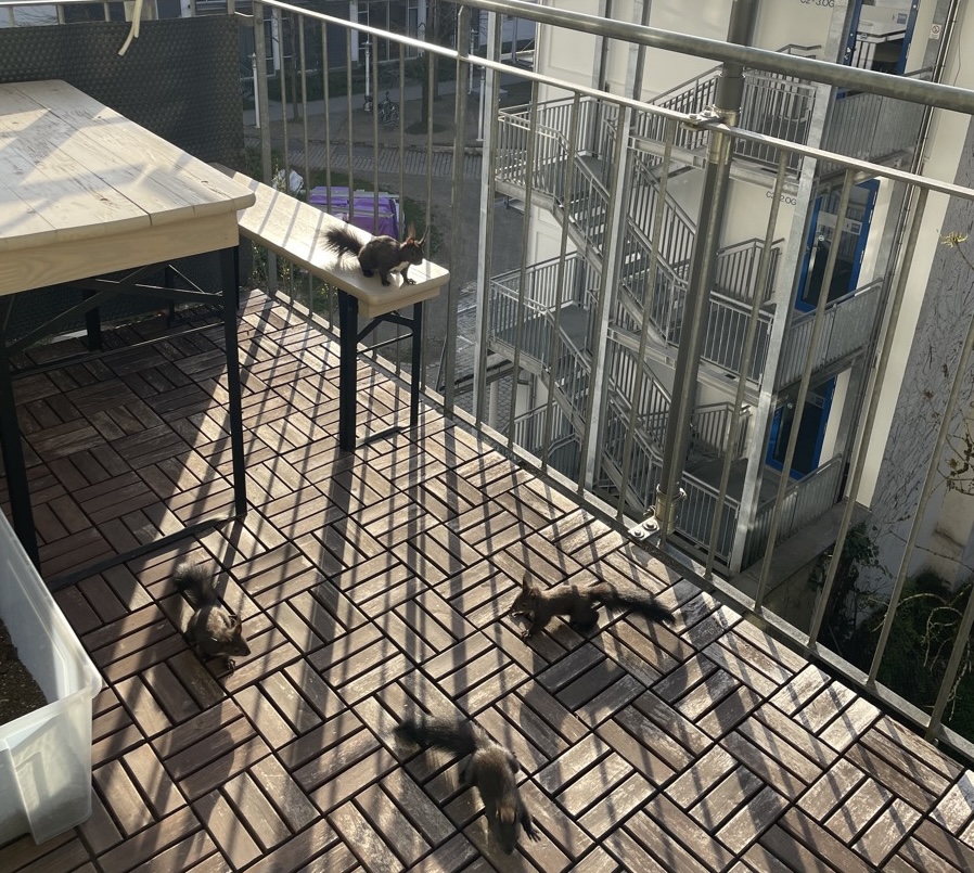 Chip & Chap | Aufwachen durch konstantes Trippeln auf dem Balkon. Eine Eichhörnchenfamilie hat sich - mal wieder - eingemietet. Wir hatten die letzten Jahre schon öfter Spaß mit den kleinen Puschels. Highlight: Nüsse im Pferdekopf versteckt.