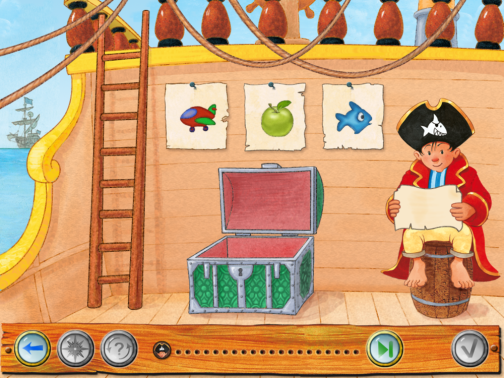 Ebenfalls aus Deutschland kommt die App mit dem Matrosen Fiete. Der begrüßt uns auf dem Startbildschirm winkend, und wir können dann mit einfacher Wischgeste weiter nach rechts scrollen. Auf einer schön illustrierten Insellandschaft gibt es insgesamt 18 verschiedene Icons, hinter denen sich jeweils kleine Geschichten oder einfache Spiele verbergen. Man muss z.B. ein Mini-Memory lösen, Fiete den richtigen Hut aufsetzen oder die Matrosensocken in den Wäschekorb einsortieren.