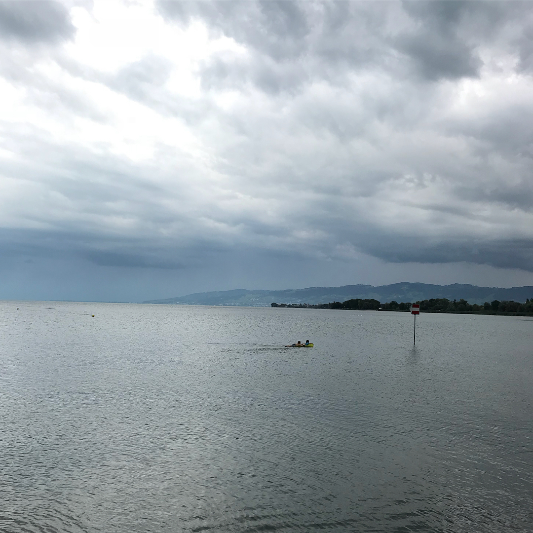 Baden im See. Diesmal mit Luftmatratze. Das Wasser auf schweizer Seite ist deutlich wärmer, weil die Gemeinden so reich sind, dass sie den See mit riesigen Tauchsiedern (rechts im Bild) auf Badewannentemperatur erwärmen können.