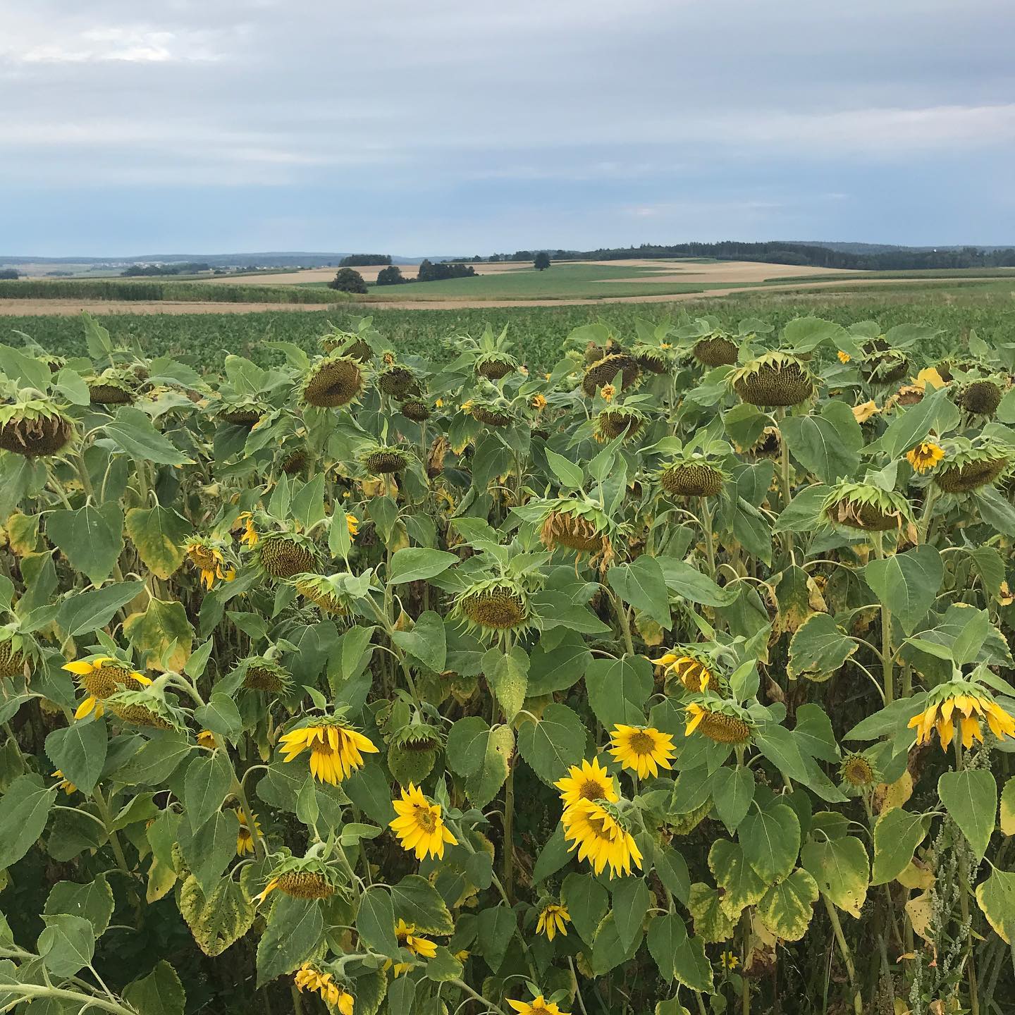 Früh am Morgen guckt noch kurz die Sonne durch. Aber die Sonnenblumen und das Rotwild lassen schon die Köpfe hängen. Die Natur ist einfach die beste Wetter-App. Auf nach Pfaffenhofen!
