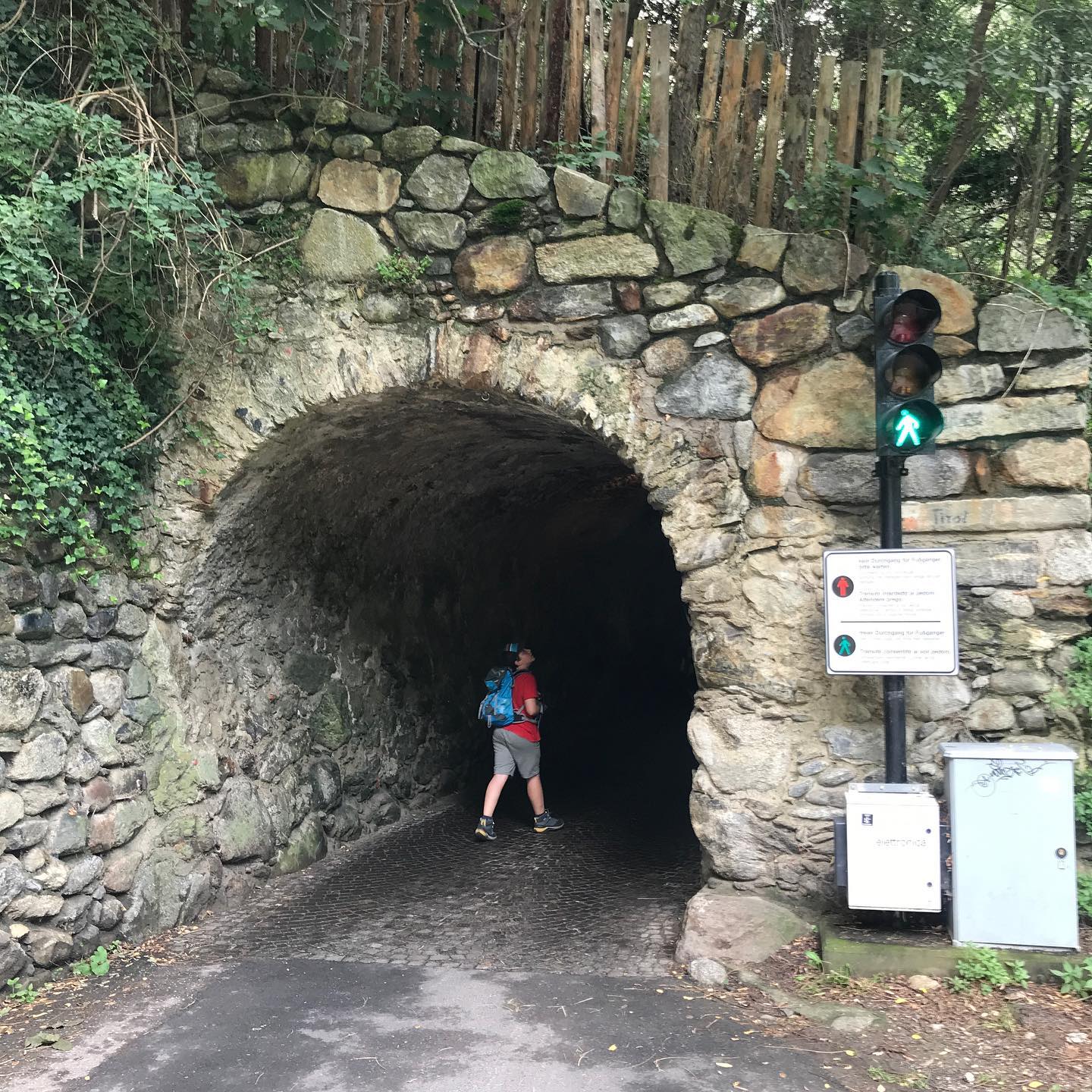 Oberhalb von Meran liegt Dorf Tirol. Der Ort besteht aus Restaurants, Souvenirläden, Hotels und einer Kirche. Von da aus geht es mit der Hochmuth-Seilbahn nach oben (Hochmuth kommt vor dem Höhenweg). Die ersten 45 Minuten entlang des sehr schönen, ausgesetzten Höhenwegs bis zur Leiteralm. Bergab geht es am Anfang unterhalb des Korblifts Vellau (echte „Standseilbahn“) immer weiter runter und schließlich wieder rüber zum Schloss Tirol. Eingang nach Dorf Tirol nur bei Fußgängergrün am Tunnel. Hinter den Gräbern der Eingang zur öffentlichen Bibliothek.