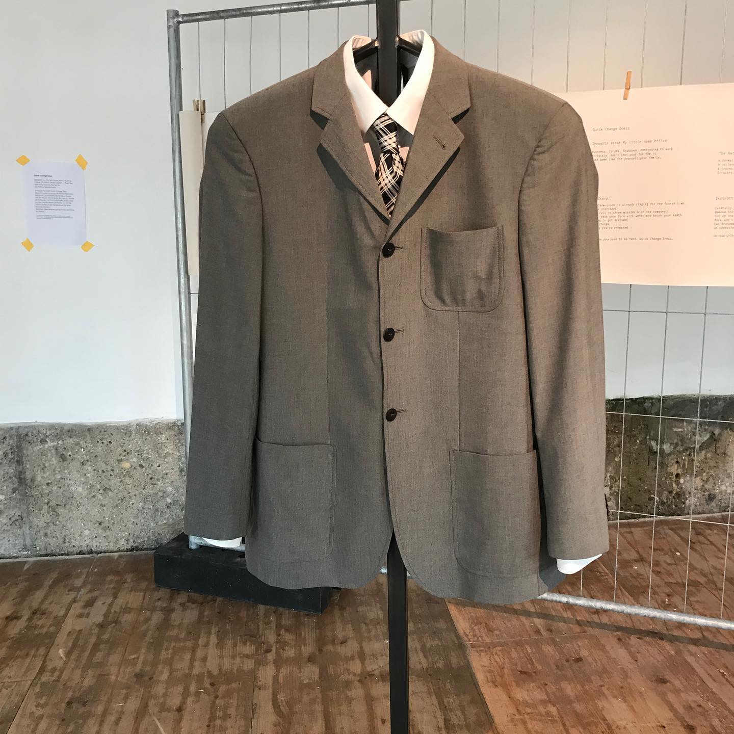 Der Business-Corona-Sakko (inkl. Hemd) ist hinten offen. Wie ein OP-Hemd. Ideal für die spontane Zoom-Konferenz.