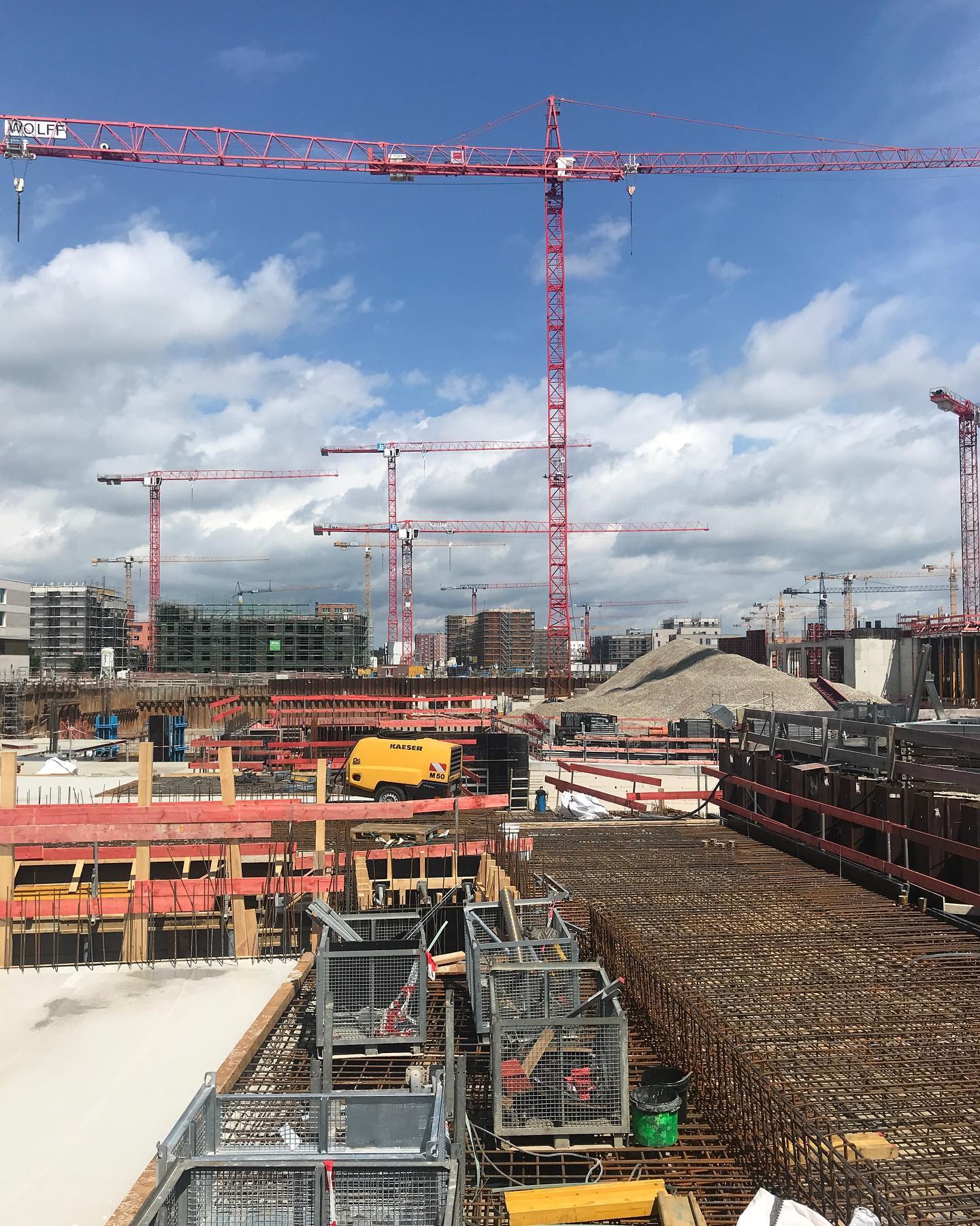 Grüner Felder vor Kränen. In Freiham wird gebaut, am Germeringer See lässt man auf der Beinebaumelbank die Beine baumeln. Tour im Blog: 🚴♂️